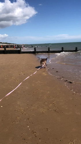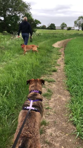 Rusty regularly goes off site on different walks in different scenarios - she travels well - she’s always confident and loves to explore - she often attends our local events and is always friendly with people and other dogs.